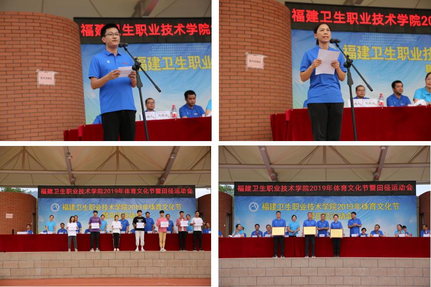 在高亢激揚的進行曲中,國旗、校旗護旗隊、牌隊、彩旗隊、花隊和各班級代表隊在田徑場就位。組委會副主任宋維宣讀系部組織獎、系部體育道德風(fēng)尚獎、班級體育道德風(fēng)尚獎獲獎、學(xué)生優(yōu)秀教練員及優(yōu)秀裁判員名單。副總裁判長鄧素華宣讀第九套廣播體操、功夫扇獲獎集體、學(xué)生體育明星、學(xué)生班級團體總分和名次、學(xué)生系部團體總分和名次,教職工團體總分和名次。校領(lǐng)導(dǎo)為獲獎單位和個人頒獎。