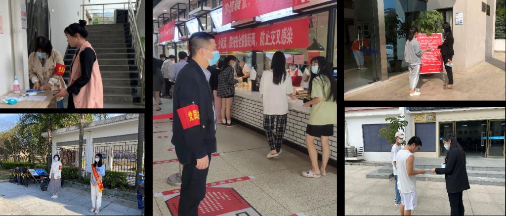 做好督導(dǎo)宣傳,穩(wěn)定校內(nèi)秩序。院直機關(guān)黨員同志們在食堂、快遞驛站、超市等校內(nèi)人流量大的區(qū)域迅速集結(jié),主動開展黨員志愿服務(wù),積極投入到秩序維護、防疫督導(dǎo)等各項工作中;各院系黨員突擊隊深入學(xué)生宿舍,進行線上教學(xué)督查;深入學(xué)生服務(wù)中心、圖書館等場所,督導(dǎo)學(xué)生規(guī)范佩戴口罩,嚴格執(zhí)行校內(nèi)防疫制度。各級黨組織凝聚力量,共同努力,充分發(fā)揮“一名黨員一面旗”的作用。