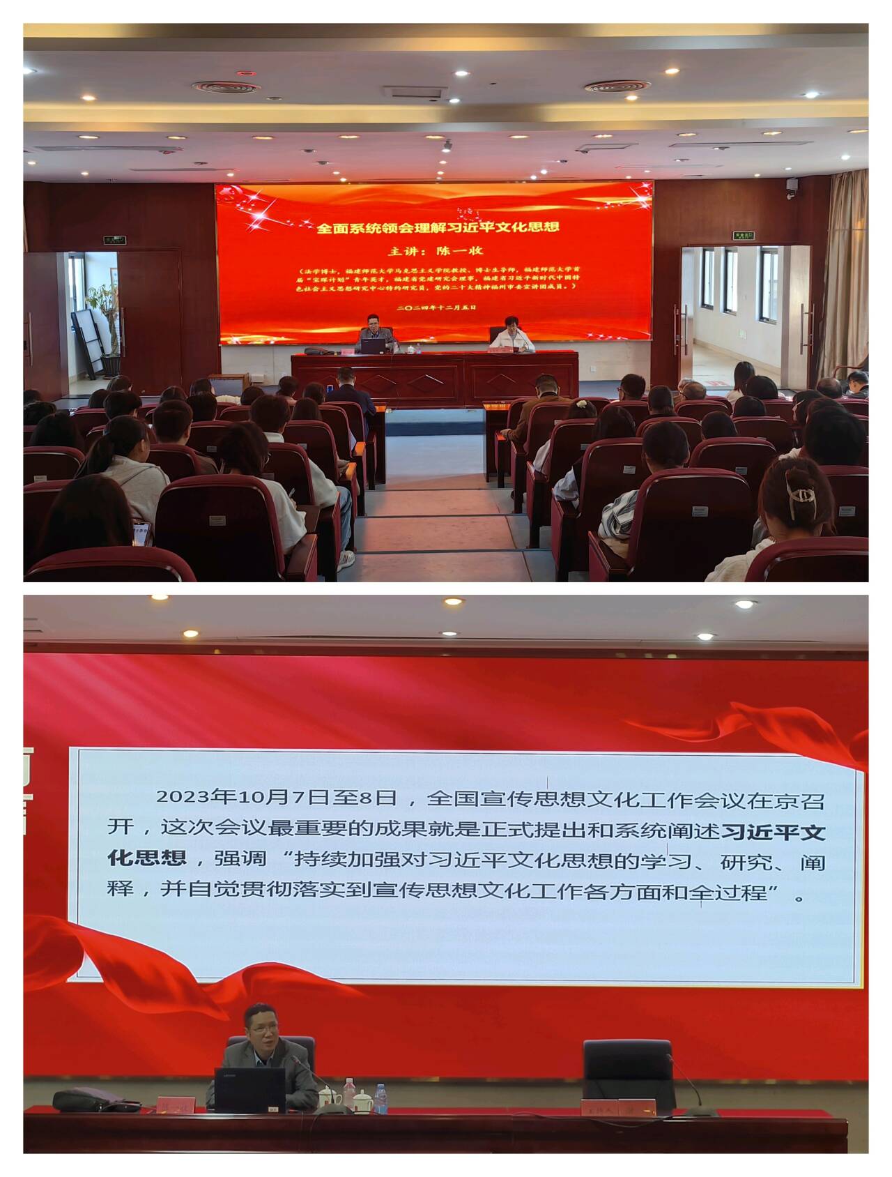 為深入貫徹黨的二十屆三中全會(huì)提出的文化建設(shè)目標(biāo),持續(xù)加強(qiáng)學(xué)習(xí)、研究、闡釋習(xí)近平文化思想,推動(dòng)文化事業(yè)創(chuàng)新發(fā)展,12月5日,我校邀請(qǐng)福建師范大學(xué)馬克思主義學(xué)院教授、博士生導(dǎo)師陳一收,在篤行樓四樓會(huì)議室開(kāi)展《全面系統(tǒng)領(lǐng)會(huì)理解習(xí)近平文化思想》專題講座。學(xué)校管理干部、馬克思主義學(xué)院全體專兼職教師、學(xué)生代表參加講座,講座由組織統(tǒng)戰(zhàn)部部長(zhǎng)謝濤主持。