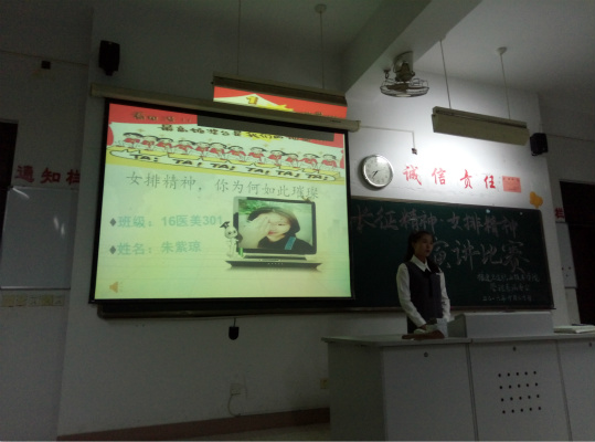 為傳承長征精神與奧運女排的拼搏精神,營造良好的校園文化氛圍。1030日晚7點管理系學生會在教學樓209教室舉辦以“自強不息,百折不撓”為主題的演講比賽,9名選手參賽。
