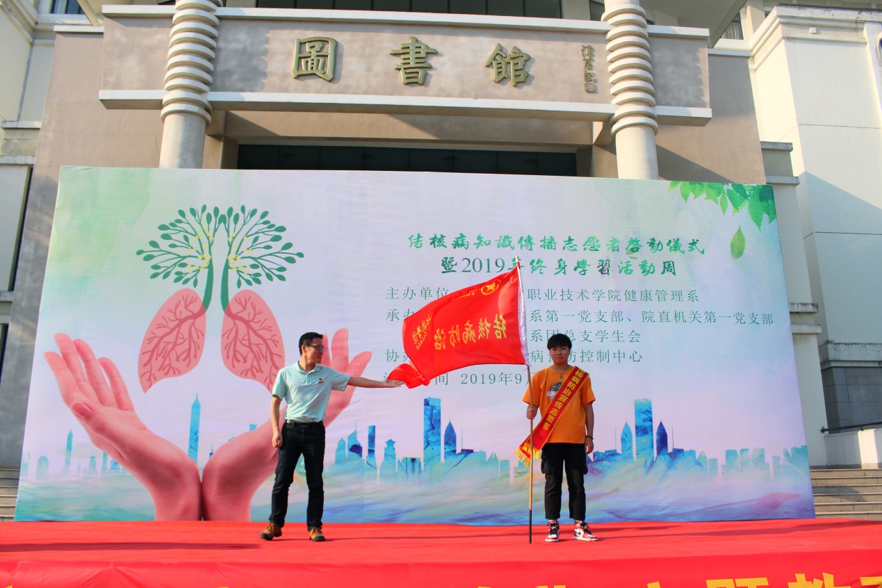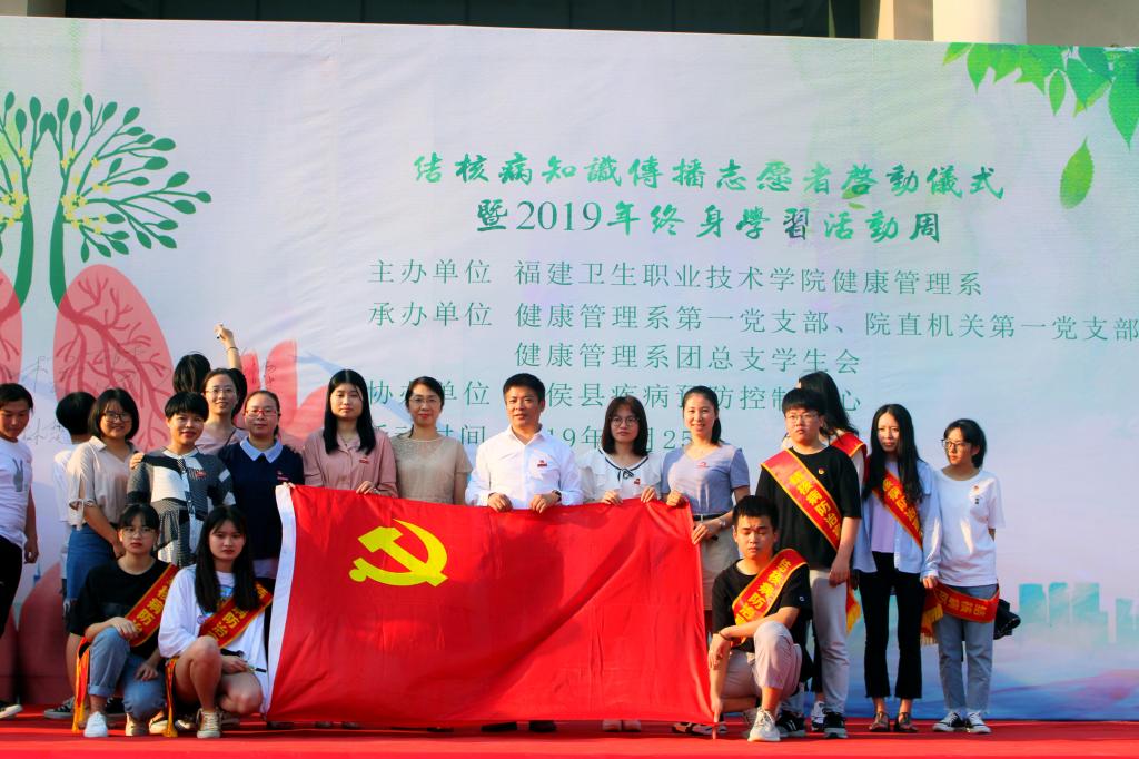 2019年9月25日,由健康管理系主辦,管理系第一黨支部、院直機(jī)關(guān)第一黨支部、健康管理系團(tuán)總支承辦的“志愿者結(jié)核病防治知識(shí)傳播啟動(dòng)儀式暨2019年終身學(xué)習(xí)活動(dòng)周”在福建衛(wèi)生職業(yè)技術(shù)學(xué)院圖書(shū)館廣場(chǎng)舉行。此次活動(dòng)是根據(jù)福建省終身教育促進(jìn)委員會(huì)關(guān)于開(kāi)展2019年“9?28終身教育活動(dòng)日”暨全民終身學(xué)習(xí)活動(dòng)周的通知精神并響應(yīng)福建省衛(wèi)生計(jì)生委推動(dòng)結(jié)核病防治知識(shí)傳播活動(dòng)的號(hào)召,在學(xué)校組建結(jié)核病防治宣傳活動(dòng)志愿團(tuán)隊(duì),發(fā)揮學(xué)生專業(yè)技能,推進(jìn)健康中國(guó)建設(shè),大力提高國(guó)民素質(zhì),并提高學(xué)生為人群健康服務(wù)的意識(shí)和決心?;顒?dòng)得到了閩侯縣CDC的大力支持,閩侯縣疾控中心江仁銜主任、福建省疾病預(yù)防控制中心黃智忠副主任醫(yī)師、院團(tuán)委黃曦書(shū)記、健康管理系黨政負(fù)責(zé)人等參加活動(dòng)。