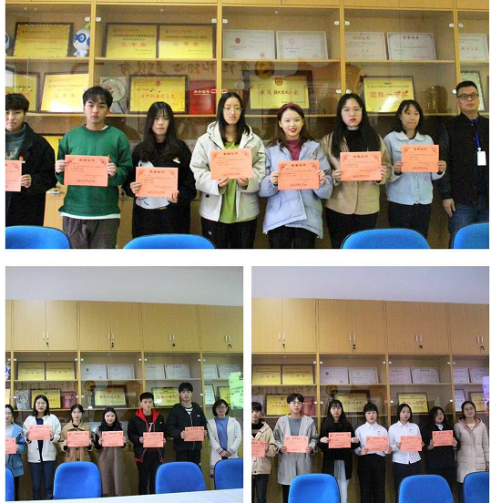管理系黨總支艾松軍書記,管理系第二黨支部書記,團總支書記馮瑞華老師,管理系團總支副書記趙茜老師,分別為獲獎者頒獎并合影留念。