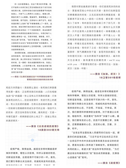 2020年的二月比任何時(shí)候都需要愛和希望,管理系學(xué)子們的聲聲加油,響應(yīng)著他們同武漢共同抗“疫”的決心。黑夜過后,總能看見最美的太陽(yáng);冬日已去,我們?cè)陂}衛(wèi)和你一起期待。我們從未像現(xiàn)在般感受彼此的牽掛,正如白巖松老師所說“隔離病毒但不隔離愛,因?yàn)閻凼菢蛄骸惫芾硐祵W(xué)子們積極成為抗“疫”一份子帶著他們的祝福和努力,給予武漢最大的支持和鼓勵(lì)。
