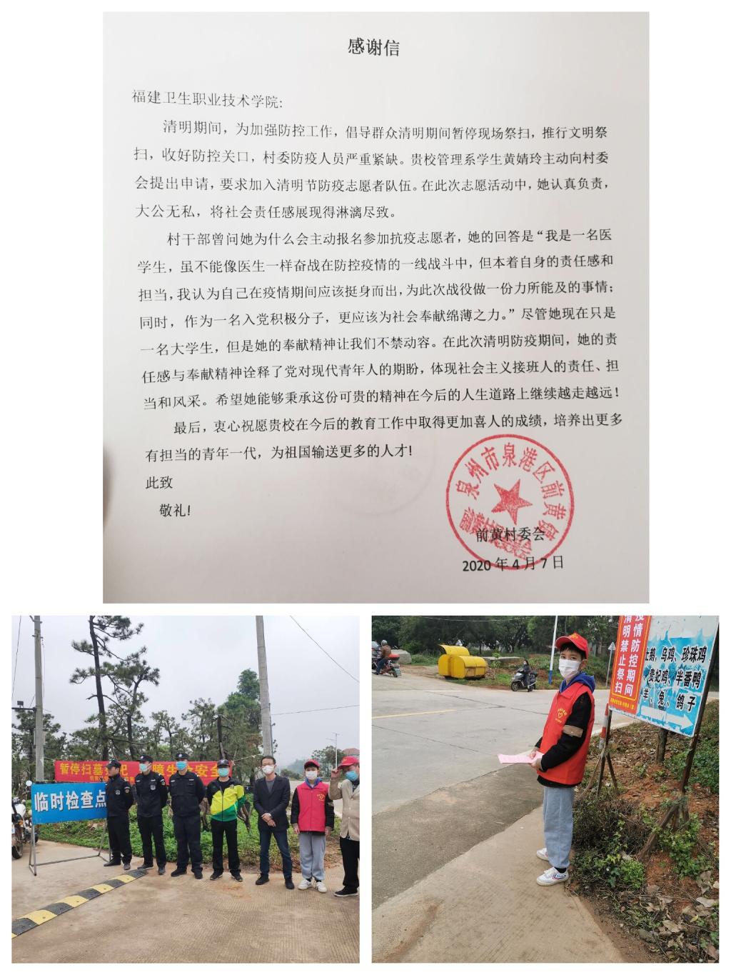 近日,我系收到了福建省泉州市泉港區(qū)前黃村委會的感謝信,感謝健康管理系19健管302班黃婧玲同學(xué)清明節(jié)期間在本村委防疫人員嚴(yán)重緊缺的情況下,積極響應(yīng)國家號召,主動請纓,志愿成為泉州市泉港區(qū)防疫志愿者中的一員。