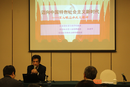 會(huì)議還邀請(qǐng)省委黨校行政學(xué)院教授林建華做了題為《邁向中國(guó)特色社會(huì)主義新時(shí)代-深入學(xué)習(xí)貫徹黨的十九大精神》專題講座。林建華教授從歷史成就、重大判斷、歷史使命與“四個(gè)偉大”、重大思想、基本方略等方面,對(duì)學(xué)習(xí)中共十九大精神進(jìn)行了深入淺出的解讀輔導(dǎo)。