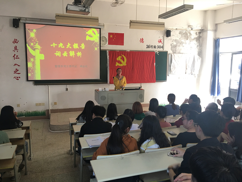 11月9日下午,黨總支組織委員、學(xué)生黨支部書記揭金花在教學(xué)樓314教為管理系第三期業(yè)余分黨校學(xué)員們講授了題為《黨的十九大詞云解析》的第一課。