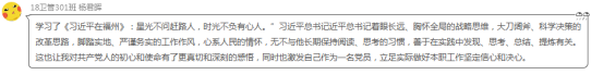 學(xué)生黨員楊君暉表示:星光不問趕路人,時(shí)光不負(fù)有心人。”習(xí)近平總書記著眼長(zhǎng)遠(yuǎn)、胸懷全局的戰(zhàn)略思維,大刀闊斧、科學(xué)決策的改革思路,腳踏實(shí)地、嚴(yán)謹(jǐn)務(wù)實(shí)的工作作風(fēng),心系人民的情懷,讓我對(duì)共產(chǎn)黨人的初心和使命有了更真切和深刻的感悟,同時(shí)也激發(fā)自己作為一名預(yù)備黨員,立足實(shí)際做好本職工作堅(jiān)定信心和決心。