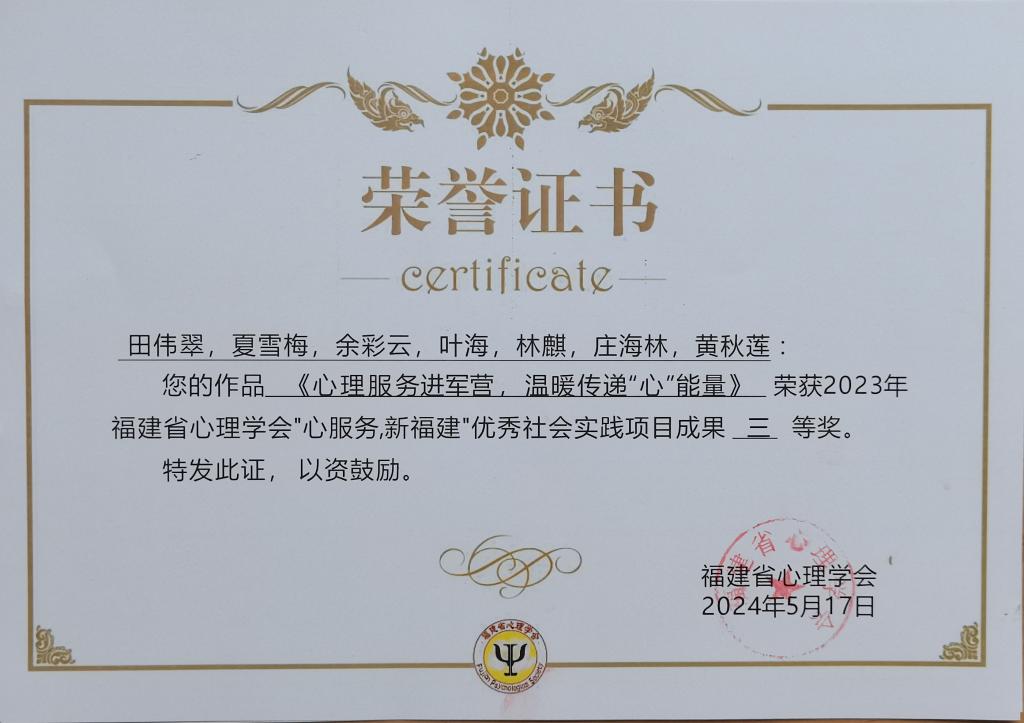 近日,福建省心理學會關于2023年“心服務,新福建”優(yōu)秀社會實踐項目成果和第八屆優(yōu)秀學術論文評選落下帷幕。經福建省心理學會理事專家評審、常務理事會和理事會審議,我校公共衛(wèi)生與健康管理學院報送的社會實踐項目成果《心理服務進軍營,溫暖傳遞“心”能量》榮獲優(yōu)秀社會實踐項目成果三等獎;田偉翠老師報送的學術論文《大學生喪親后認知變量的變化及對創(chuàng)傷悲痛的影響》榮獲第八屆優(yōu)秀學術論文教師組三等獎。