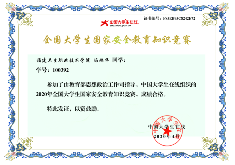 在認真學習了“2020同上一堂國家安全教育課”以后,廣大師生黨員,紛紛參與國家安全知識競賽,并獲得了·全國大學生國家安全教育知識競賽證書。