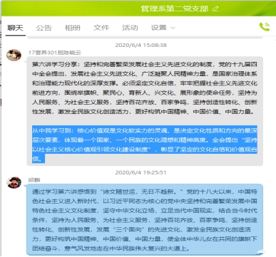 6月4日,管理系第二黨支部借助學習強國平臺學習了十九屆四中全會精神—中國制度十三講中的第六講:堅持和完善繁榮發(fā)展社會主義先進文化制度。黨的十九屆四中全會提出,發(fā)展社會主義先進文化、廣泛凝聚人民精神力量,是國家治理體系和治理能力現(xiàn)代化的深厚支撐。必須堅定文化自信,牢牢把握社會主義先進文化前進方向,圍繞舉旗幟、聚民心、育新人、興文化、展形象的使命任務,堅持為人民服務、為社會主義服務,堅持百花齊放、百家爭鳴,堅持創(chuàng)造性轉(zhuǎn)化、創(chuàng)新性發(fā)展,激發(fā)全民族文化創(chuàng)造活力,更好構(gòu)筑中國精神、中國價值、中國力量。