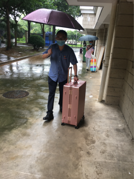 校園內(nèi),不僅有暴雨,更有關(guān)愛???,那邊王國(guó)浩老師正在幫忙提行李。