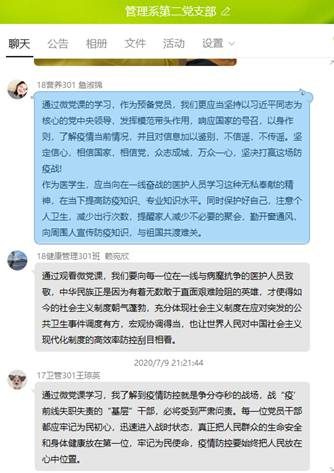 觀看微黨課后,全體黨員通過QQ群分享心得體會。教師黨員邱麟表示:通過微黨課的學習,體會到共產黨人敢于出擊,敢戰(zhàn)能勝,挺起敢于斗爭的精神脊梁。要切實增強“四個意識”、堅定“四個自信”、做到“兩個維護”,把人民群眾生命安全和身體健康放在第一位,把疫情防控工作作為當前最重要的工作來抓,同時間賽跑、與病魔較量,爭分奪秒戰(zhàn)疫情,堅決打嬴疫情防控阻擊戰(zhàn)。