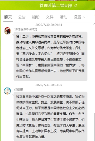 2020年7月30日,管理系第二黨支部借助學(xué)習(xí)強國平臺學(xué)習(xí)了“治國理政大家讀”系列第十二講:堅持和完善獨立自主的和平外交政策。黨的十九屆四中全會提出,要堅持和完善獨立自主的和平外交政策,推動構(gòu)建人類命運共同體。新中國成立后確立了獨立自主的和平外交政策,倡導(dǎo)和平共處五項原則,打破了“國強必霸”、“大國必戰(zhàn)”的西方邏輯。而推動構(gòu)建人類命運共同體則是在人類歷史發(fā)展進程的新高度上,中國外交的重要目標(biāo)和努力方向。提出必須統(tǒng)籌國內(nèi)國際兩個大局,高舉和平、發(fā)展、合作、共贏旗幟,堅定不移維護國家主權(quán)、安全、發(fā)展利益,堅定不移維護世界和平、促進共同發(fā)展。