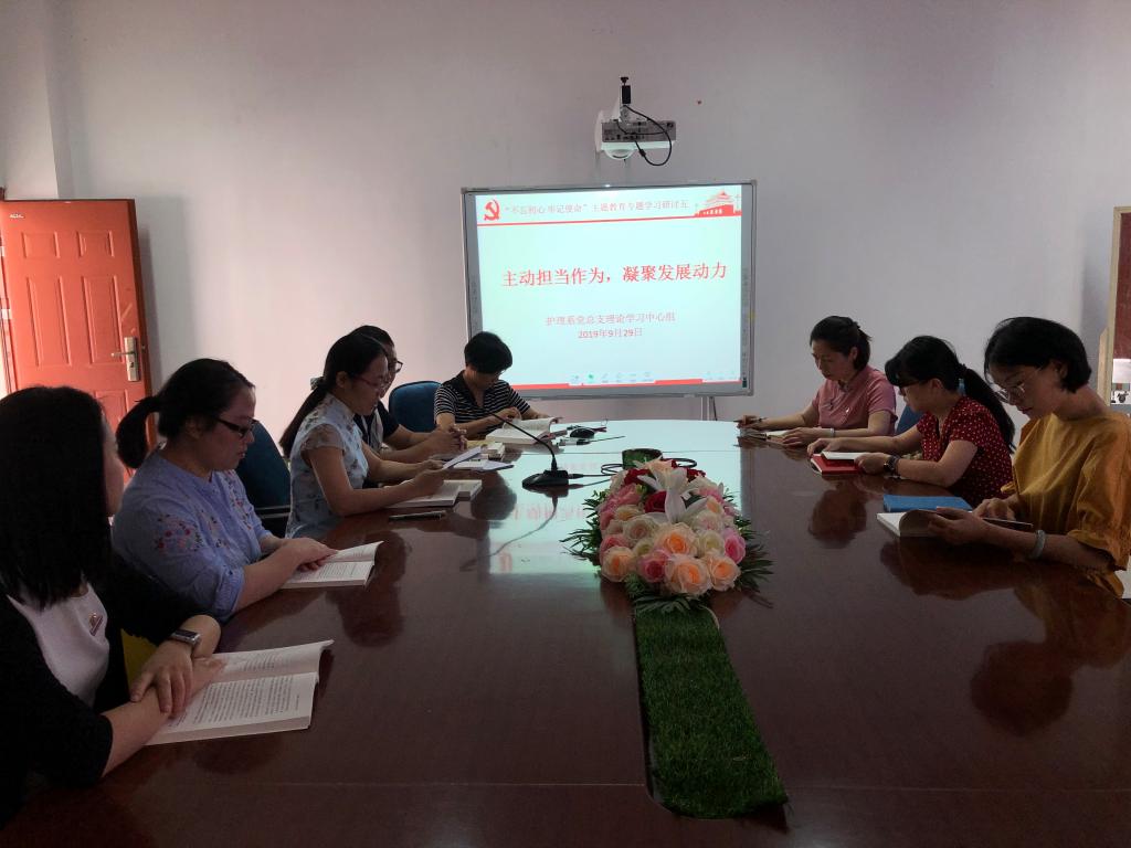 9月29日,護(hù)理系黨總支在系部會(huì)議室開展主題為“主動(dòng)擔(dān)當(dāng)作為,凝聚發(fā)展動(dòng)力”專題學(xué)習(xí)研討交流會(huì)。護(hù)理系黨總支書記謝濤同志主持會(huì)議,護(hù)理系黨政聯(lián)席會(huì)班子成員、護(hù)理系黨總支委員會(huì)委員參加了本次學(xué)習(xí)研討,護(hù)理系第一支部書記賈箐箐與學(xué)生支部書記許慧瓊作主要交流發(fā)言。。