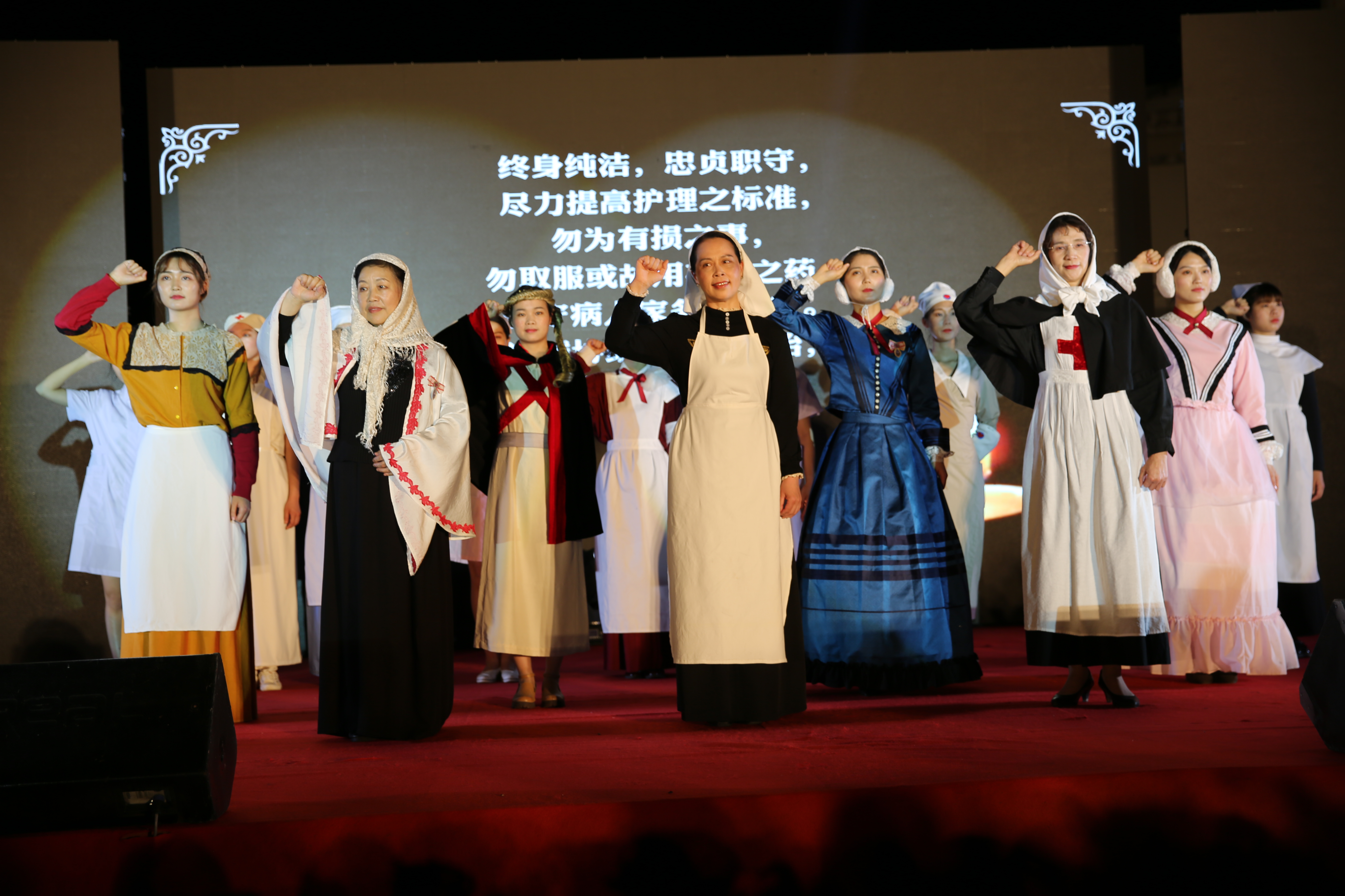 晚會(huì)舞臺(tái)設(shè)置在學(xué)院音樂廣場,背景采用巨型LED墻幕,舞美、燈光設(shè)計(jì)集現(xiàn)代氣息、傳統(tǒng)風(fēng)格于一身,各色燈光交錯(cuò),流光異彩,給所有觀眾耳目一新的感覺。晚會(huì)以一支富有創(chuàng)意的韓舞——《BBoomm Boomm》開場,瞬間點(diǎn)燃全場氣氛。接著,護(hù)理系師生邀請護(hù)理前輩共同演出的護(hù)士服飾年代秀《護(hù)士服裝演變史》登場。這場節(jié)目通過不同年代的護(hù)士服裝演繹了南丁格爾的傳奇一生,展現(xiàn)了我院百年辦學(xué)歷史和文化傳承,表達(dá)出對(duì)護(hù)理事業(yè)的無限深情和獻(xiàn)身護(hù)理事業(yè)的決心。演員們生動(dòng)的表演引發(fā)全場轟動(dòng)。隨后,教師代表們?yōu)閷W(xué)生戴上潔白神圣的燕帽,全體護(hù)理師生重溫了《南丁格爾誓言》——“終身純潔、忠貞職守,盡力提高護(hù)理之標(biāo)準(zhǔn),……”句句誓言發(fā)自肺腑、鏗鏘有力,陣陣回聲響徹在青春校園,令在場觀眾深受鼓舞。