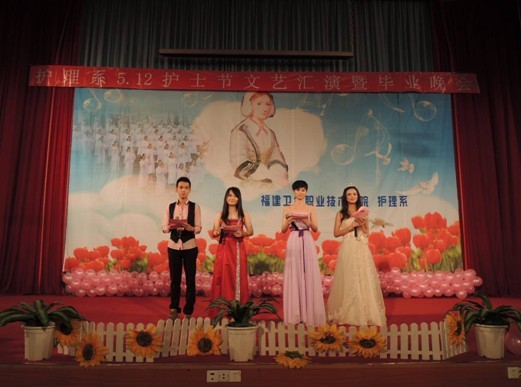 福建衛(wèi)生職業(yè)技術(shù)學(xué)院護理系于2013年5月7日晚7:00在學(xué)術(shù)廳迎來了5.12護士節(jié)文藝匯演暨畢業(yè)晚會。院黨委陳雄副書記、黃開良副院長、魏立娜副院長、學(xué)生工作處黃銘珊處長、護理系黨總支謝濤書記、院團委宋維副書記及各系團總支書記、老師、輔導(dǎo)員蒞臨了本次晚會。