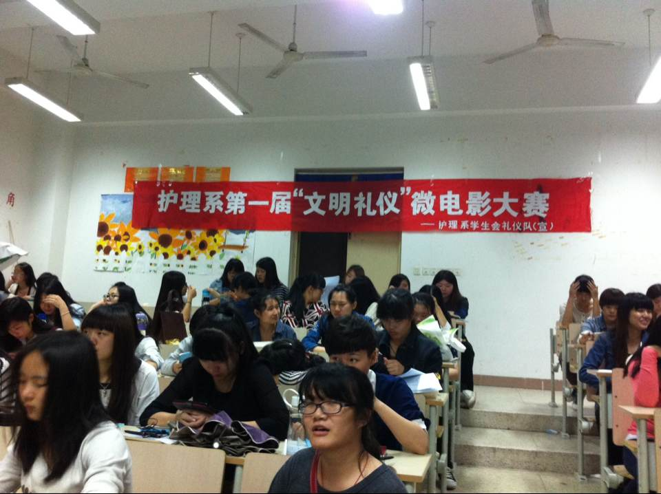 為豐富同學(xué)們的課余生活,展現(xiàn)我校大學(xué)生健康向上、文明、環(huán)保的精神風(fēng)貌,在我系領(lǐng)導(dǎo)的支持與關(guān)心下,在同學(xué)們的熱情關(guān)注下,由護(hù)理系學(xué)生會(huì)主辦的以“文明禮儀”為主題的微電影比賽于4101930-2120在教學(xué)樓214拉開帷幕。
