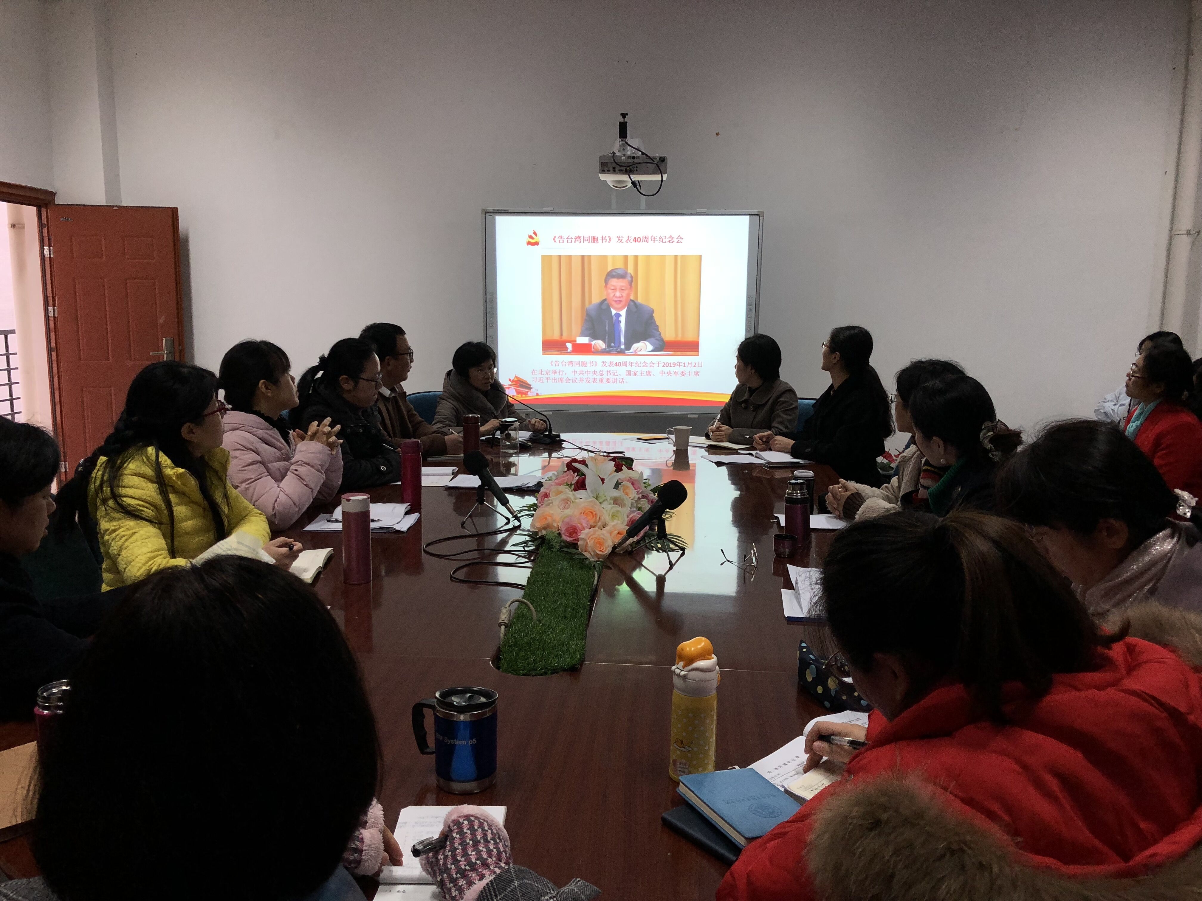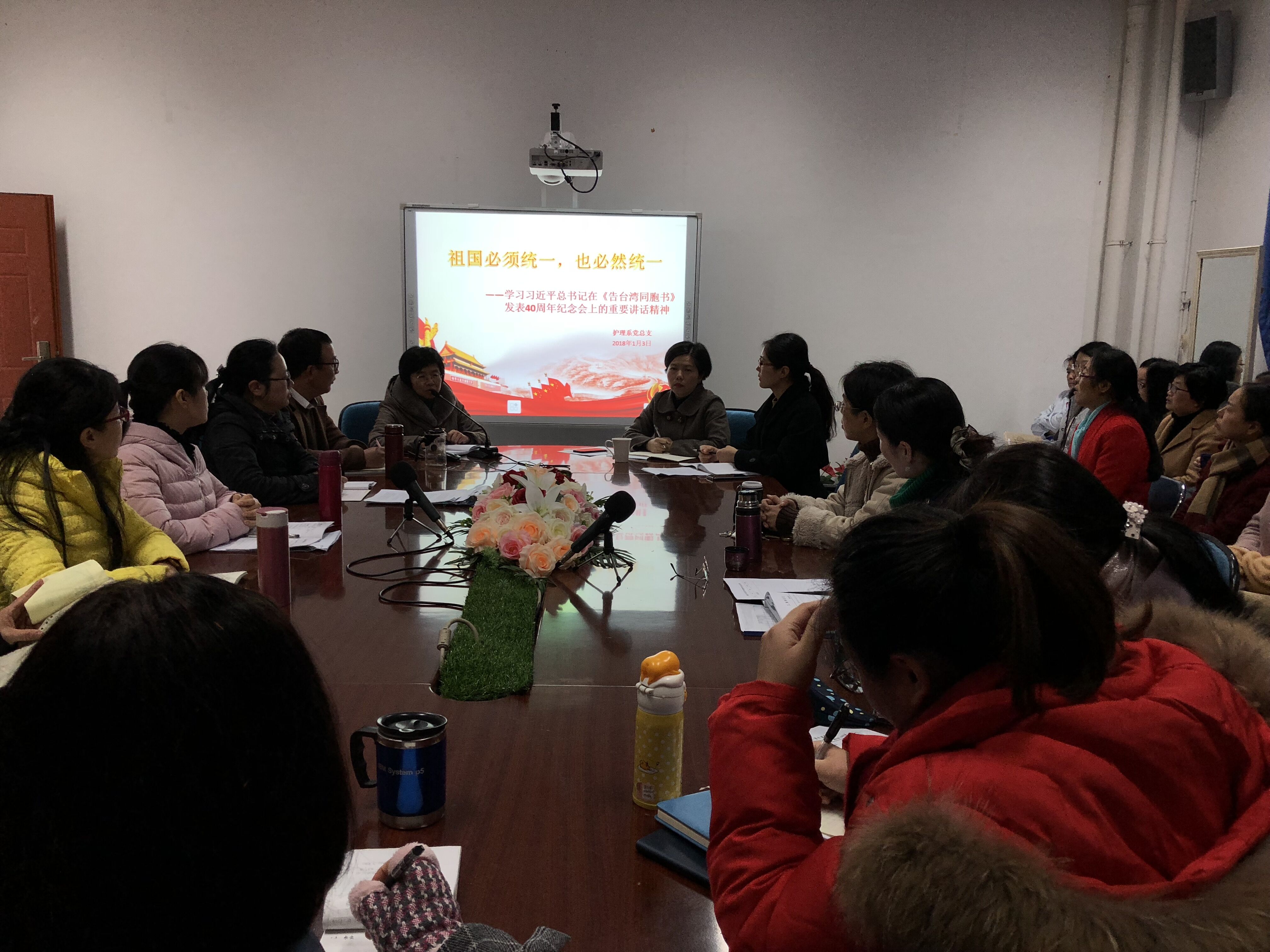 1月2日,《告臺灣同胞書》發(fā)表40周年紀念會在北京人民大會堂舉行,習近平總書記出席紀念會并發(fā)表重要講話。為充分學習領會習近平總書記的重要講話精神,2019年1月3日,護理系黨總支于護理系301會議室組織學習了習近平總書記在《告臺灣同胞書》發(fā)表40周年紀念會上的重要講話精神。此次會議由護理系黨總支謝濤書記主持,護理系全體教職工參加了此次學習。