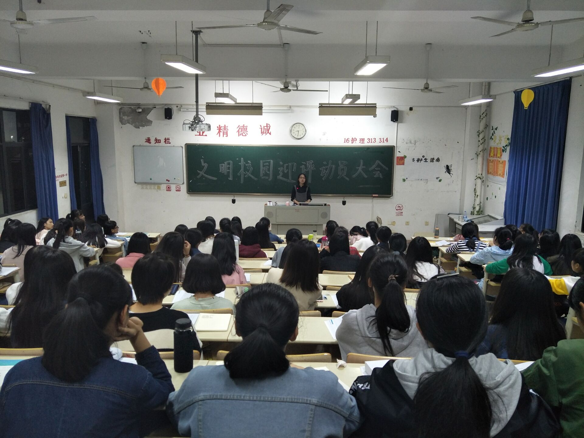 2017年11月6日晚上7:00,護(hù)理系召開迎接省級文明校園檢查學(xué)生工作動員大會。大會首先由謝濤書記、林桂松副書記向全體輔導(dǎo)員傳達(dá)學(xué)院迎評精神和學(xué)生管理工作布置要求。接下來,由輔導(dǎo)員組織各班級召開專題班會,將學(xué)院工作精神傳達(dá)到每一位學(xué)生,并對每名學(xué)生的精神面貌、行為規(guī)范、環(huán)境美化都提出了具體的要求,鼓勵學(xué)生以積極的心態(tài)投入迎評工作,也當(dāng)作一次精神的洗禮。