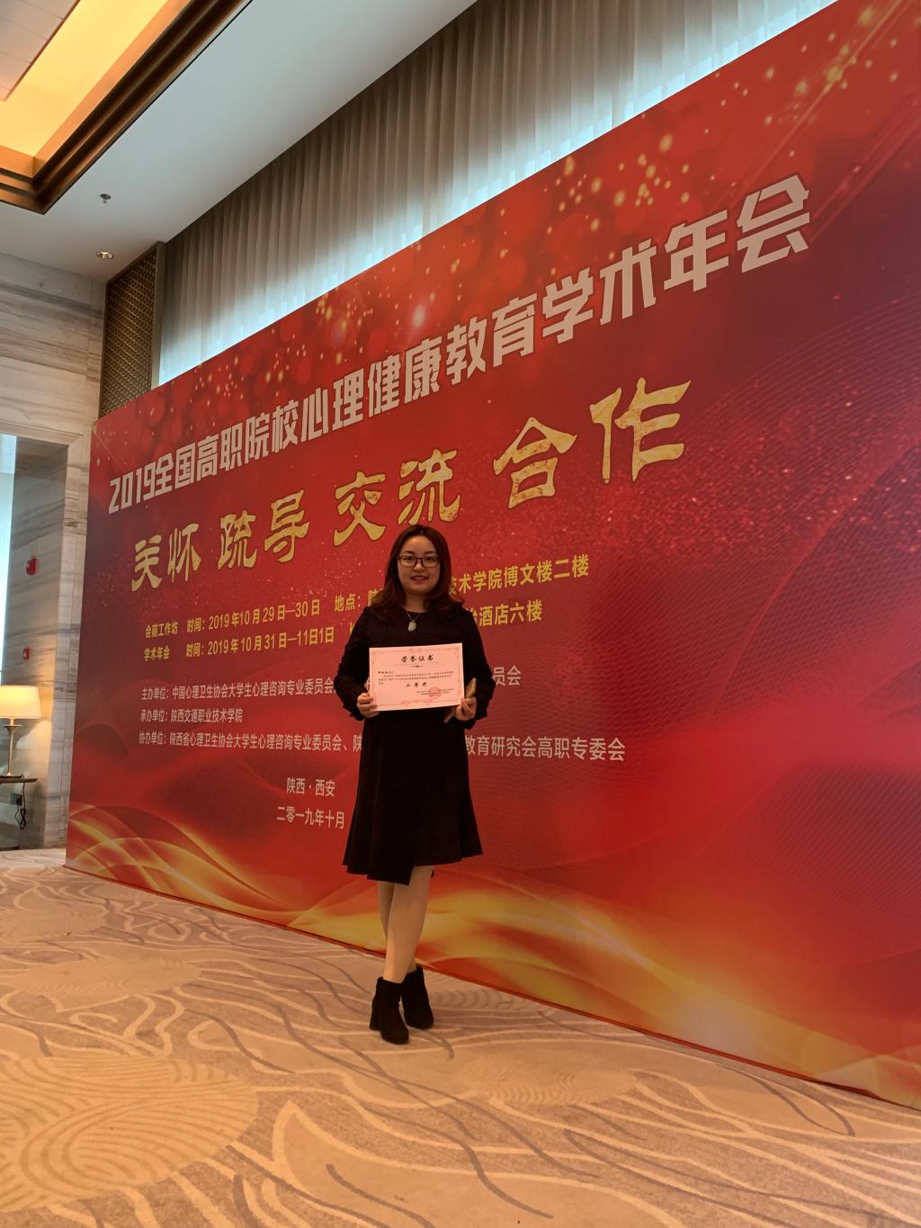 2019年10月31日—11月1日,護理系選派心理輔導站鄭梅欽老師參加了于陜西西安舉行的“2019年全國高職院校心理健康教育學術年會暨表彰大會”。本次大會以“關懷 疏導 交流 合作”為主題,圍繞高職院校育心與育德工作相結合的模式、心理育人五位一體工作新格局建設研究、精神衛(wèi)生法框架下的高職院校心理育人的創(chuàng)新性探索、大數(shù)據(jù)技術合作與高職院校心理育人的信息化管理研究、心理育人工作與學生管理工作聯(lián)動機制實踐研究、高職院校學生心理咨詢與心理危機預防干預案例研究、高職院校學生心理育人工作體制機制和隊伍建設研究等七個議題,開展深入的交流和研討。