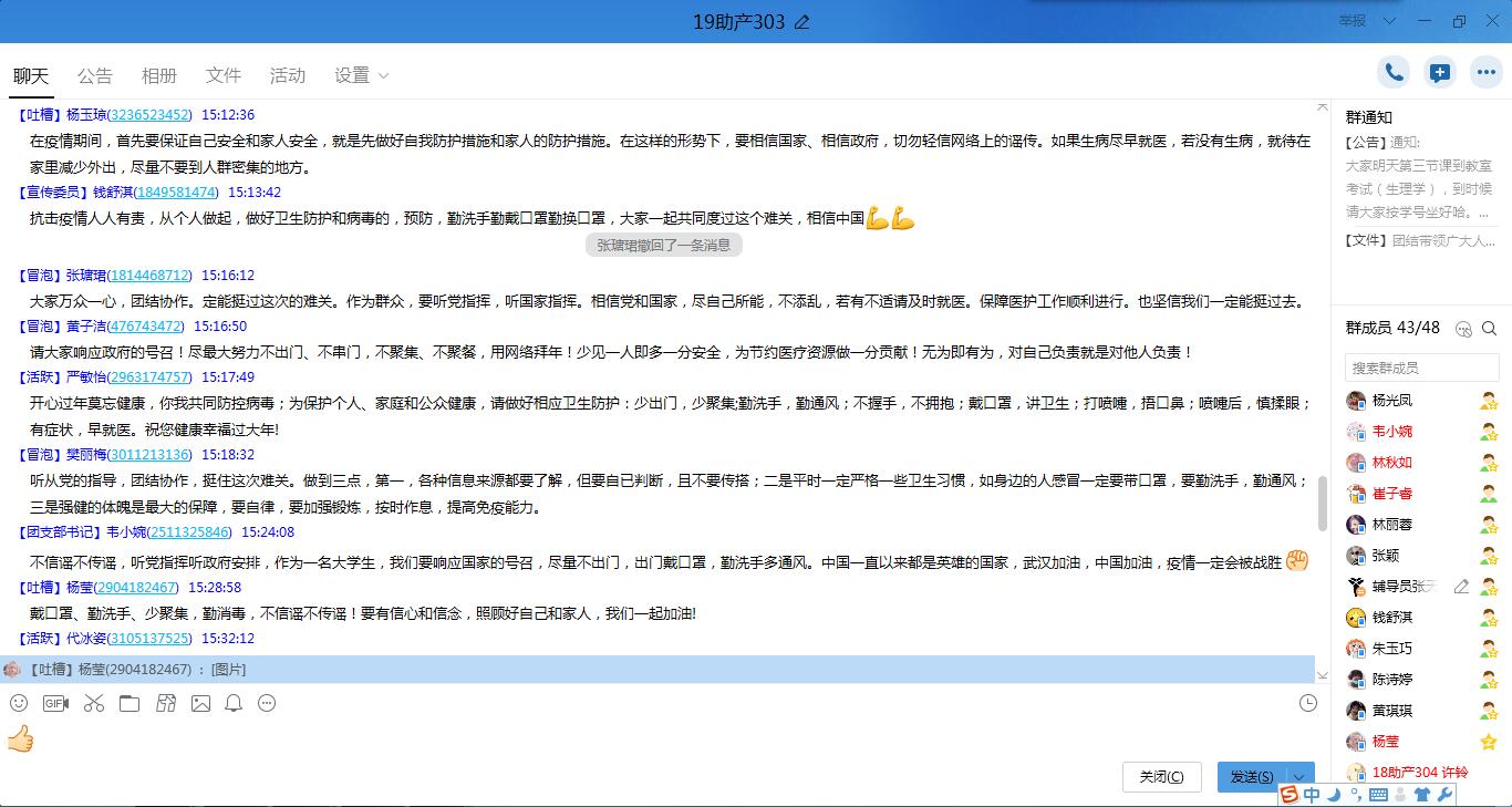 1月29日,護理系各黨支部以學習強國視頻會議的形式召開黨員大會,護理系各班級以QQ群視頻會議、YY視頻會議等形式召開主題班會,將習近平總書記關于當前新型冠狀病毒感染肺炎疫情防控工作重要指示精神以及學院黨委中心組(擴大)會議精神等傳達到每位師生。