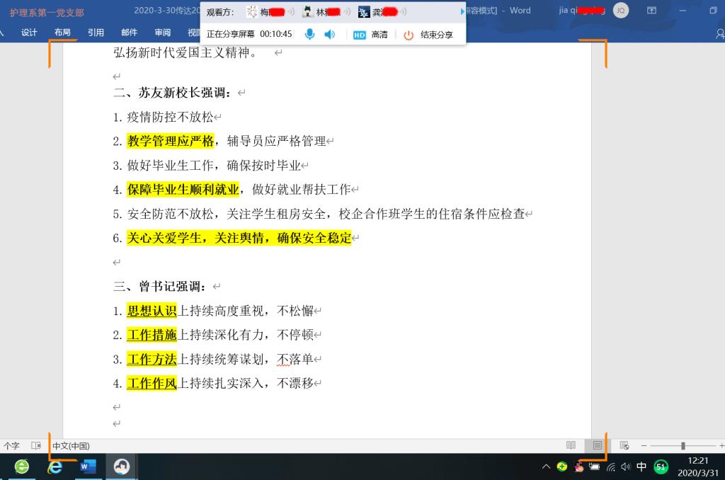 學(xué)院疫情防控領(lǐng)導(dǎo)小組第七次會(huì)議暨開(kāi)學(xué)前工作部署會(huì)后,護(hù)理系黨總支中心組、各黨支部、各教研室等通過(guò)線上線下的形式,認(rèn)真將會(huì)議精神傳達(dá)到每位黨員、教職工。