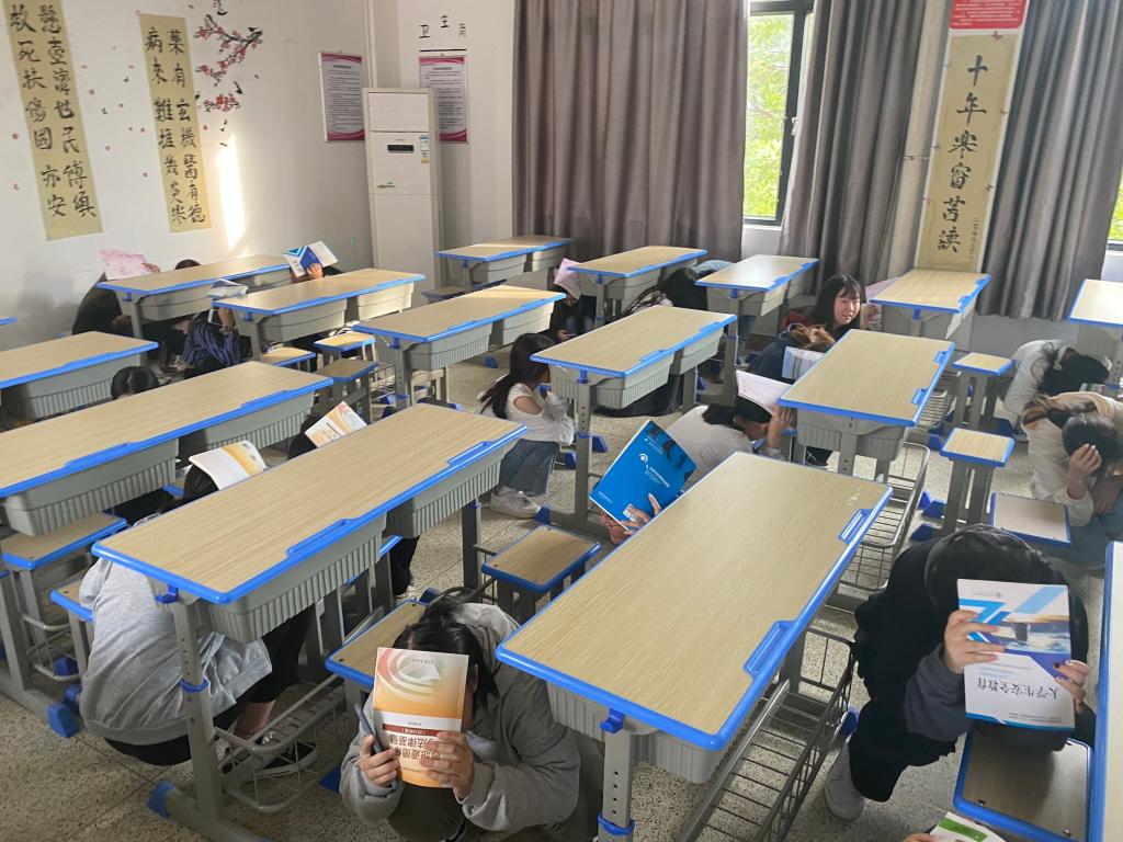 為保證演練順利開展,系部預(yù)先制定演練方案,明確演練步驟及人員,保衛(wèi)處林捷老師對參加演練的人員進(jìn)行了安全知識培訓(xùn),并進(jìn)行現(xiàn)場演示。下午330,教學(xué)樓黃煙四起、警報鈴響,各位老師迅速到達(dá)指定崗位,現(xiàn)場指揮發(fā)出第一次避險指令,學(xué)生根據(jù)演練要求,在課桌及墻角蹲下,等待現(xiàn)場指揮發(fā)出逃生指令;在現(xiàn)場指揮發(fā)出逃生指令后,學(xué)生們紛紛用手、濕紙巾等捂住口鼻,彎著腰從預(yù)定的逃生路線進(jìn)行撤離,撤退過程井然有序,僅用3分鐘,參加本次演練的1000多名學(xué)生全部安全撤離到指定區(qū)域。