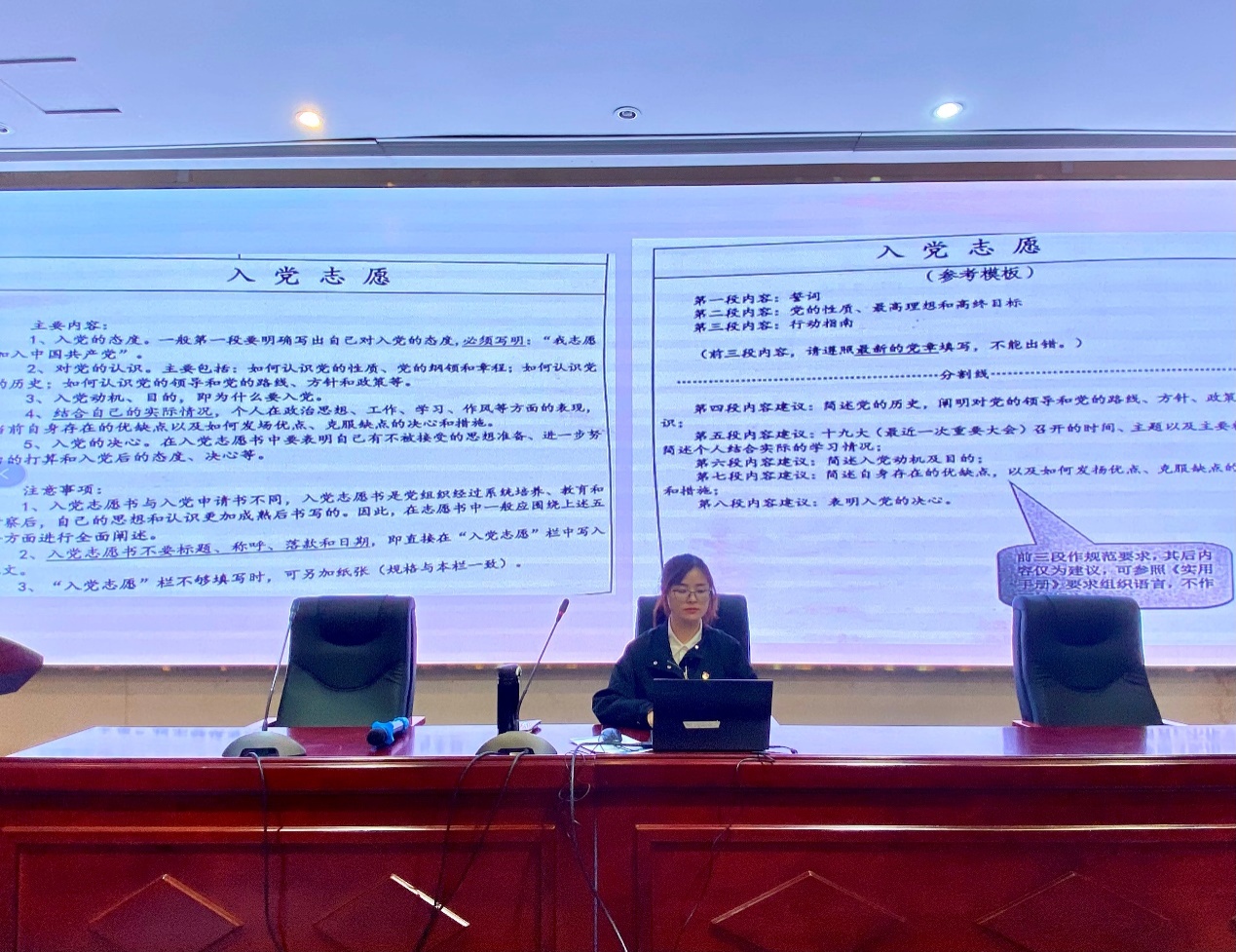 鄒艷輝從入黨的基本流程開(kāi)始講起,從自愿向黨組織提出入黨申請(qǐng)、確定入黨積極分子、對(duì)入黨積極分子進(jìn)行考查和培養(yǎng)、發(fā)展對(duì)象培養(yǎng),預(yù)備期考察到最后預(yù)備黨員轉(zhuǎn)正,詳細(xì)講解了《入黨申請(qǐng)書(shū)》、《思想?yún)R報(bào)》、《自傳》、《入黨志愿書(shū)》以及《入黨轉(zhuǎn)正申請(qǐng)書(shū)》幾類入黨文書(shū)的寫(xiě)作格式內(nèi)容及注意事項(xiàng),強(qiáng)調(diào)了文書(shū)書(shū)寫(xiě)過(guò)程中注重樸實(shí),真實(shí),不可過(guò)于華而不實(shí)。