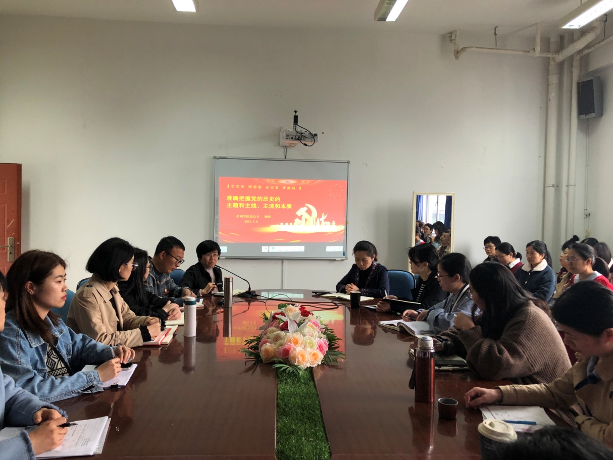為深入學(xué)習宣傳貫徹習近平新時代中國特色社會主義思想,大力推進黨史學(xué)習教育,2021年4月8日,護理學(xué)院黨總支在護理學(xué)院會議室開展“準確把握黨的歷史主題和主線、主流和本質(zhì)”——學(xué)黨史 悟思想 辦實事 開新局專題黨課,本次黨課由護理學(xué)院黨總支書記謝濤主講。