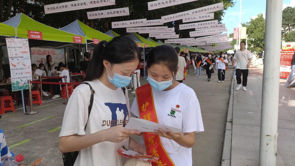 迎新帳篷下,學(xué)長學(xué)姐耐心講解報(bào)到流程,耐心叮囑填寫好每一份資料,話語輕柔,讓這場初識格外溫暖。