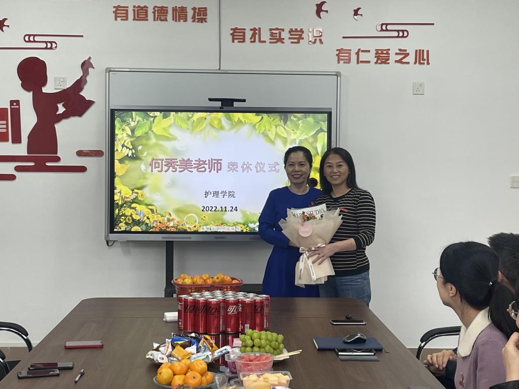 11月24日下午,護(hù)理學(xué)院301會議室涌動著溫情的氣氛。護(hù)理學(xué)院全體領(lǐng)導(dǎo)班子、各教研室教師代表、實訓(xùn)中心全體教師齊聚一堂,為光榮退休的何秀美老師舉行歡送會。