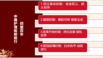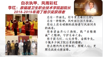 洪霞老師她深情回望百年中國護理砥礪前行的發(fā)展史,民主革命時期:1888年,列強的堅船利炮中,我國首家注冊護士學?!鹆_倫薩·南丁格爾護士和助產(chǎn)士培訓學校,在福州誕生。新中國成立初期:建國伊始,百廢待興,護理事業(yè)煥發(fā)勃然生機,進入了整頓、規(guī)劃、發(fā)展階段。改革開放時期:借著改革的東風,護理事業(yè)抽枝發(fā)芽,蓬勃生長。黨和國家是護理事業(yè)發(fā)展的指路明燈。新冠肺炎疫情時期:從李紅書記的先進事跡出發(fā),講述了李紅書記帶領福建護理隊馳援武漢,在這場沒有硝煙的戰(zhàn)場中踐行南丁格爾精神。接著生動地講述了2020~2022年我們身邊的戰(zhàn)“疫”逆行者。