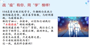 洪霞老師通過挖掘抗擊疫情過程中的鮮活素材,引導學生以戰(zhàn)“疫”中的同學為榜樣,學習最美逆行者的崇高精神,與時代同頻共振,肩負起當代青年大學生的使命和擔當。她還詳細講解了我們國家為防止疫情蔓延推出的一系列重要決定和有效措施,以及中華民族在面對重大磨難時,形成的萬眾一心、同舟共濟的強大合力,引導學生能夠更好地發(fā)揚愛國主義精神,增強民族自信心和自豪感,樹立責任意識和大局意識。