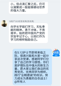 護士節(jié)來臨之際,護理學院第二黨支部書記(雙帶頭人)洪霞充分把握育人契機,組織了一堂有政治高度、情感溫度和理論深度“云”黨課,對護理學院全體入黨積極分子們進行生命教育、信念教育、科學教育、道德教育,切實做好學生價值觀引領