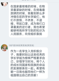 “珍惜當下,感恩前行”。在黨課最后,洪霞老師特別提到了“90后”、“00后”在抗擊疫情中的突出表現(xiàn),并號召同學們應心系天下,爭當有理想、有本領、有擔當?shù)臅r代新人。同學們表示深受鼓舞,感悟頗豐,在黨課后積極發(fā)言熱烈討論,紛紛表示定會在日后的學習和工作中向學長們學習不忘初心、發(fā)奮圖強、不負使命、不負青春。