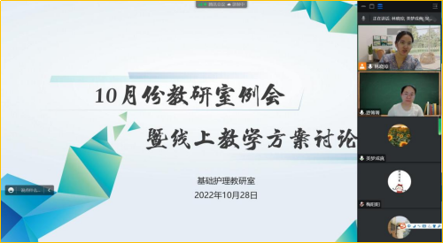 線上教學(xué)開啟前,基礎(chǔ)護(hù)理教研室全體老師在騰訊會(huì)議上召開了“互助共享,提高線上實(shí)訓(xùn)教學(xué)有效性”為主題線上教學(xué)方案討論。結(jié)合以往線上實(shí)訓(xùn)教學(xué)存在的問題進(jìn)行交流,大家積極反思,各抒己見,總結(jié)出兩大類問題,分別是:1.實(shí)操課用物場地受限;2.師生互動(dòng)受影響。老師們?nèi)翰呷毫?,共同研討解決問題的方案,通過靈活調(diào)整教學(xué)進(jìn)度,直播時(shí)開啟攝像頭、連麥互動(dòng)等方式保證教學(xué)效果。