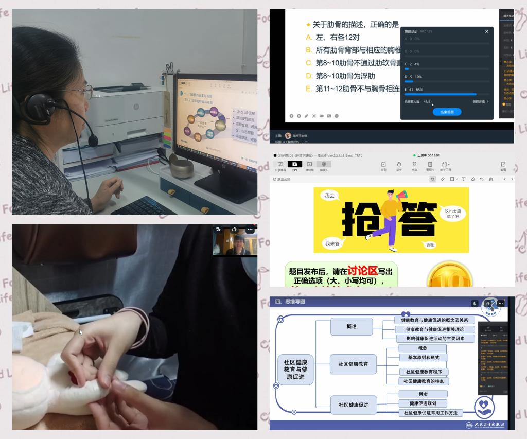 內(nèi)科護(hù)理教研室洪霞:為了更好地開展線上教學(xué),我提前發(fā)布問卷了解學(xué)生情況與需求,正式直播前和同學(xué)們一起熟悉線上授課平臺,了解學(xué)習(xí)要求。課堂上我時(shí)刻關(guān)注學(xué)生在留言板上的留言,通過課堂提問、連麥導(dǎo)讀等方式,激發(fā)學(xué)生的學(xué)習(xí)主動(dòng)性和積極性。課后我布置同學(xué)們撰寫個(gè)人周課程筆記、制作小組導(dǎo)讀ppt、拍攝操作視頻等方式幫助同學(xué)們更好的鞏固知識。在我和同學(xué)們的共同努力下,取得了良好的教學(xué)效果。