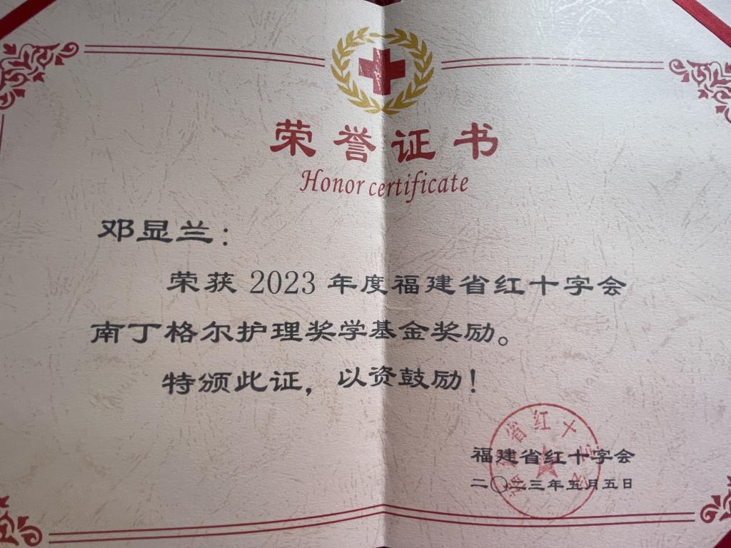 5月13日,福建省紅十字會(huì)2023年度南丁格爾護(hù)理獎(jiǎng)學(xué)基金頒獎(jiǎng)儀式在福州舉行,我校護(hù)理學(xué)院2020級(jí)護(hù)理309班鄧顯蘭同學(xué)獲此殊榮。