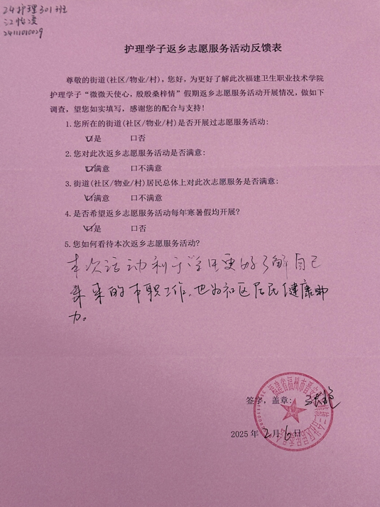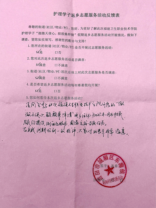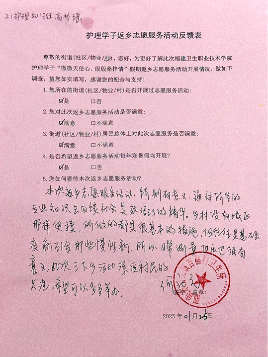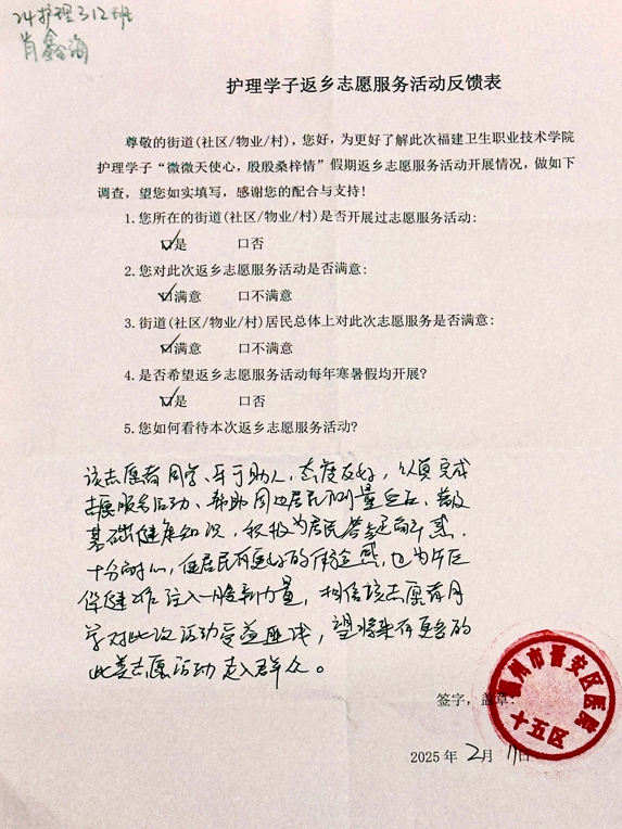 在這個(gè)寒冬里,護(hù)理學(xué)院學(xué)子帶著“微微天使心,殷殷桑梓情”來到大家身邊。一場義診活動(dòng),溫暖了整個(gè)社區(qū)。大家紛紛表達(dá)著感激。讓我們來翻閱鄉(xiāng)親們的反饋表,上面真誠的文字,就像一面鏡子,映照出志愿者們的熱忱與付出,也見證著鄰里間因?yàn)檫@場活動(dòng)愈發(fā)緊密的情誼。每一張表,都是一份認(rèn)可,承載著鄉(xiāng)親對(duì)學(xué)子們深深的謝意。