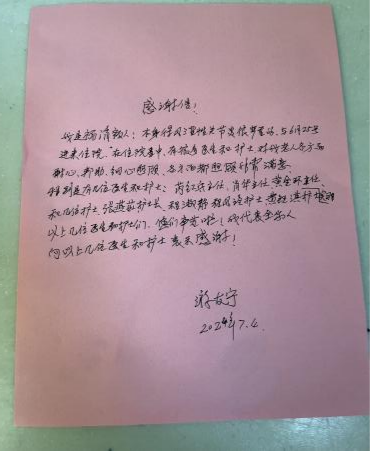 黃鈺淇同學在事后說道:“其實我也沒做什么特別的事,就是跟患者聊聊天,幫他們打打留置針、輸輸液、量量血壓這些日常護理。但收到這封感謝信的時候,我真的挺開心的,因為感覺自己的工作得到了患者的認可和感謝。以后,我也會繼續(xù)努力,更加細心地照顧每一位患者,希望他們都能快點好起來!”