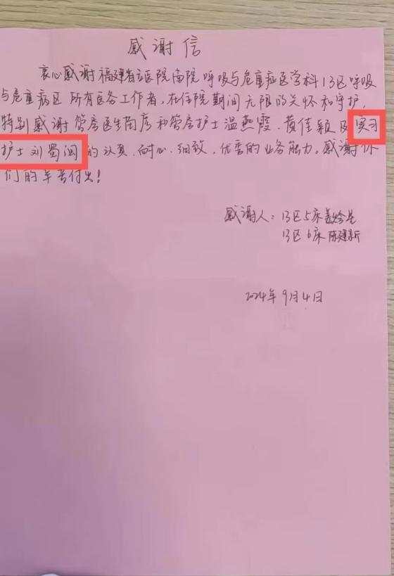 近日,護(hù)理學(xué)院22護(hù)理309班劉蜀閩同學(xué),在福建省立南院呼吸與危重癥醫(yī)學(xué)科13區(qū)呼吸與危重病區(qū)實(shí)習(xí)期間,收到了住院患者的親筆感謝信。科室護(hù)士長及科室老師也對劉蜀閩同學(xué)護(hù)理工作給予了高度認(rèn)可。