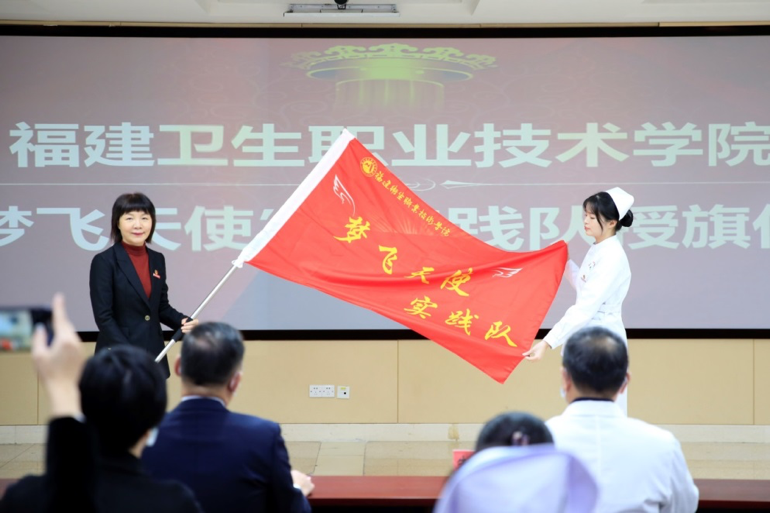 李美華授予護理學(xué)院“夢飛天使”實踐隊隊旗,希望“夢飛天使”實踐隊的同學(xué)們能弘揚偉大的抗疫精神,堅定信心、增強斗志,意氣風(fēng)發(fā)地投身福建醫(yī)藥衛(wèi)生事業(yè)發(fā)展,為新發(fā)展階段新福建建設(shè)作貢獻。