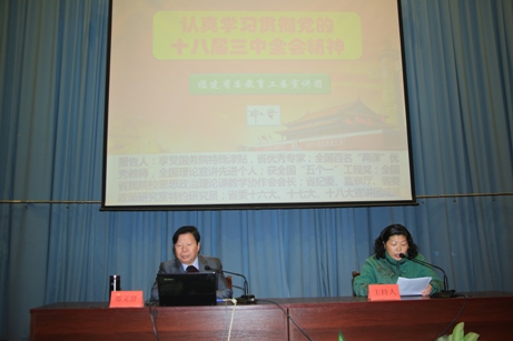 根據(jù)省委教育工委《關(guān)于開展黨的十八屆三中全會精神宣講活動的通知》精神,3月4日下午,我院邀請省委宣講團(tuán)成員、福建師范大學(xué)博士生導(dǎo)師鄭又賢教授來校作《認(rèn)真學(xué)習(xí)貫徹黨的十八屆三中全會精神》的宣講報告。在家院領(lǐng)導(dǎo)、全體教職工、學(xué)生預(yù)備黨員及院學(xué)生會干部共400余人與會聆聽報告,宣講會由副院長魏立娜同志主持。