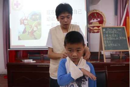 關(guān)愛鄉(xiāng)村兒童,共筑健康中國夢。實踐團教育關(guān)愛小分隊的志愿者們屏南縣棠口村開展愛心支教活動,急救包扎、兒童防騙、傳統(tǒng)養(yǎng)生功夫、繪畫夢想、衛(wèi)生常識、兒童營養(yǎng)……志愿者與孩子們共同編織著一個七彩的夢。“我終于知道受傷流血的時候怎么去止血,怎么減輕自己的疼痛感了?!眰鹘y(tǒng)養(yǎng)生功法課上,“我也來一個,我也來一個……”小朋友們紛紛要求露一手。夢想繪畫課上,孩子們繪就醫(yī)生、老師、特種兵、超人宇航員等,從他們的繪畫中,志愿者們也感受著孩子的童真與偉大夢想。“嗯,我們要緊跟著爸爸媽媽,不能被壞人用糖果騙走?!眱和莉_課上,小朋友小丁這樣認(rèn)真地說。孩子們用稚嫩的話語和志愿者們暢想未來,在孩子們堅定的眼神里我們相信我們心中的健康夢、中國夢一定會實現(xiàn)。