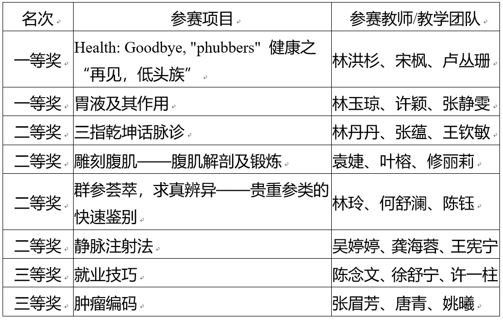 6月初,由福建省教育廳舉辦“網龍杯”2019年福建省職業(yè)院校教師教學能力比賽中,我院參賽項目從156件參賽項目中脫穎而出,其中林洪杉(主講)、宋楓、盧叢珊團隊的課程《Health: Goodbye, "phubbers" 健康之“再見,低頭族”》和林玉瓊(主講)、許穎、張靜雯團隊的課程《胃液及其作用》榮獲高職組一等獎;林丹丹(主講)、張?zhí)N、王欽敏團隊的課程《三指乾坤話脈診》,袁婕(主講)、葉榕、修麗莉團隊的課程《雕刻腹肌——腹肌解剖及鍛煉》,林玲(主講)、何舒瀾、陳鈺團隊的課程《群參薈萃,求真辨異——貴重參類的快速鑒別》和吳婷婷(主講)、龔海蓉、王憲寧團隊的課程《靜脈注射法》榮獲高職組二等獎;陳念文(主講)、徐舒寧、許一柱團隊的課程《就業(yè)技巧》,張眉芳(主講)、唐青、姚曦的課程《腫瘤編碼》榮獲高職組三等獎。
