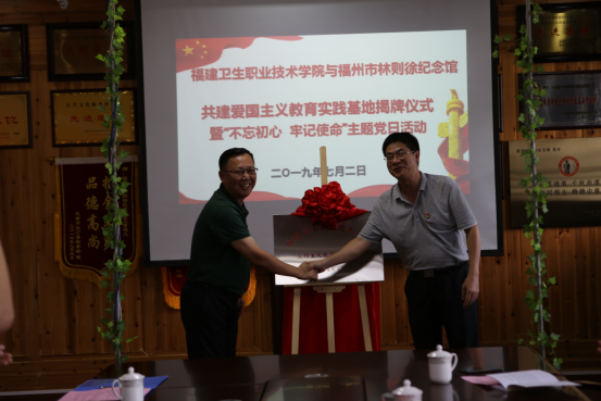 為慶祝中國共產(chǎn)黨成立98周年、迎接中華人民共和國成立70周年,大力弘揚林則徐愛國主義精神,7月2日,福建衛(wèi)生職業(yè)技術(shù)學(xué)院與福州市林則徐紀念館共建愛國主義教育實踐基地揭牌儀式暨“不忘初心 牢記使命”主題黨日活動在林則徐紀念館舉行。學(xué)院黨委書記曾武祈、團委書記黃曦、學(xué)生工作處副處長林燕、馬克思主義學(xué)院名譽院長魏立娜、馬克思主義學(xué)院直屬黨支部書記、院長熊美蘭及馬院全體黨員,林則徐紀念館黨支部書記、館長陳繼勇,副書記林虹、副館長鐘田田及林則徐紀念館黨員干部30多人參加活動。馬克思主義學(xué)院熊美蘭院長主持儀式。