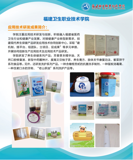 6月17日至21日,第十七屆中國(guó)·海峽項(xiàng)目成果交易會(huì)(簡(jiǎn)稱“6·18”)在福州海峽國(guó)際會(huì)展中心舉行,學(xué)院組織了14項(xiàng)應(yīng)用技術(shù)研發(fā)成果參展,主要有:含漱口水的電動(dòng)牙刷、嬰兒紙尿褲預(yù)警提醒裝置、新型中藥醒神片、“老山茶油”洗護(hù)系列、養(yǎng)生膏方、紫菜餅干、度尾文旦柚子茶、藥膳撲克牌以及肢體關(guān)節(jié)康復(fù)功法視頻和常用藥品分類游戲軟件視頻等。