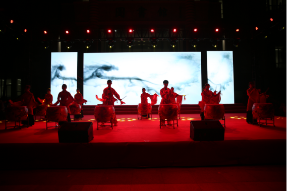 紅衣翩翩,鼓點陣陣,晚會由護理系、藥學(xué)系選送的水鼓舞表演《龍的傳人》拉開序幕。