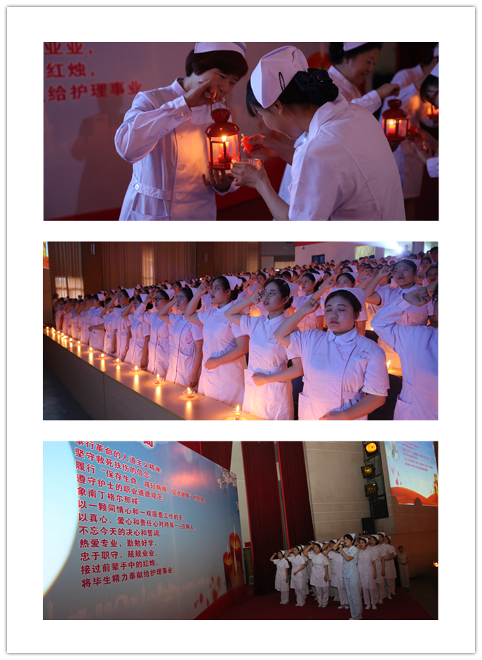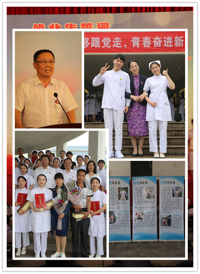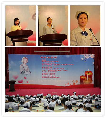 本次畢業(yè)典禮的布景和議程都經(jīng)過了精心設(shè)計。會場外,展示2019屆優(yōu)秀畢業(yè)風(fēng)采的幾十面展版吸引了同學(xué)們的目光。會場內(nèi),以南丁格爾像和紅燭造型為主題的巨幅背景墻烘托出濃濃的專業(yè)情懷。入場時,會場播放護理系宣傳片《百年筑夢·天使展翅》,回顧護理系百年辦學(xué)歷史與近年豐碩的建設(shè)成果。