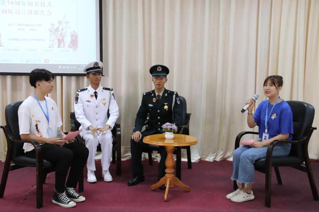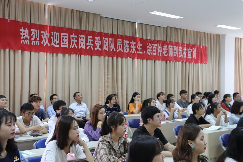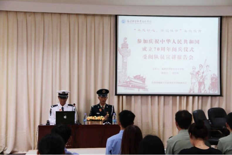 10月24日下午,我校舉行參加慶祝中華人民共和國(guó)成立70周年閱兵儀式受閱隊(duì)員宣講報(bào)告會(huì),面向青年學(xué)生開展“不忘初心、牢記使命”主題教育。受閱歸來的來自福建信息職業(yè)技術(shù)學(xué)院的陳東生、涂百仲兩位老師帶來了一場(chǎng)生動(dòng)的受閱經(jīng)歷分享報(bào)告。校紀(jì)委書記游鋒出席報(bào)告會(huì),校團(tuán)委負(fù)責(zé)同志、青馬班學(xué)員、八一學(xué)社師生共計(jì)100名參加。